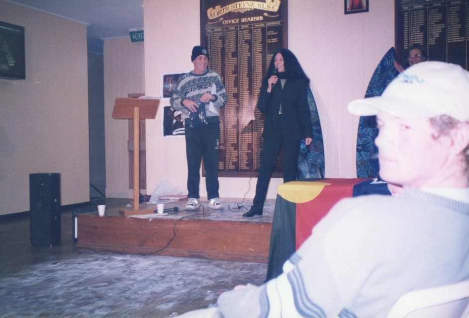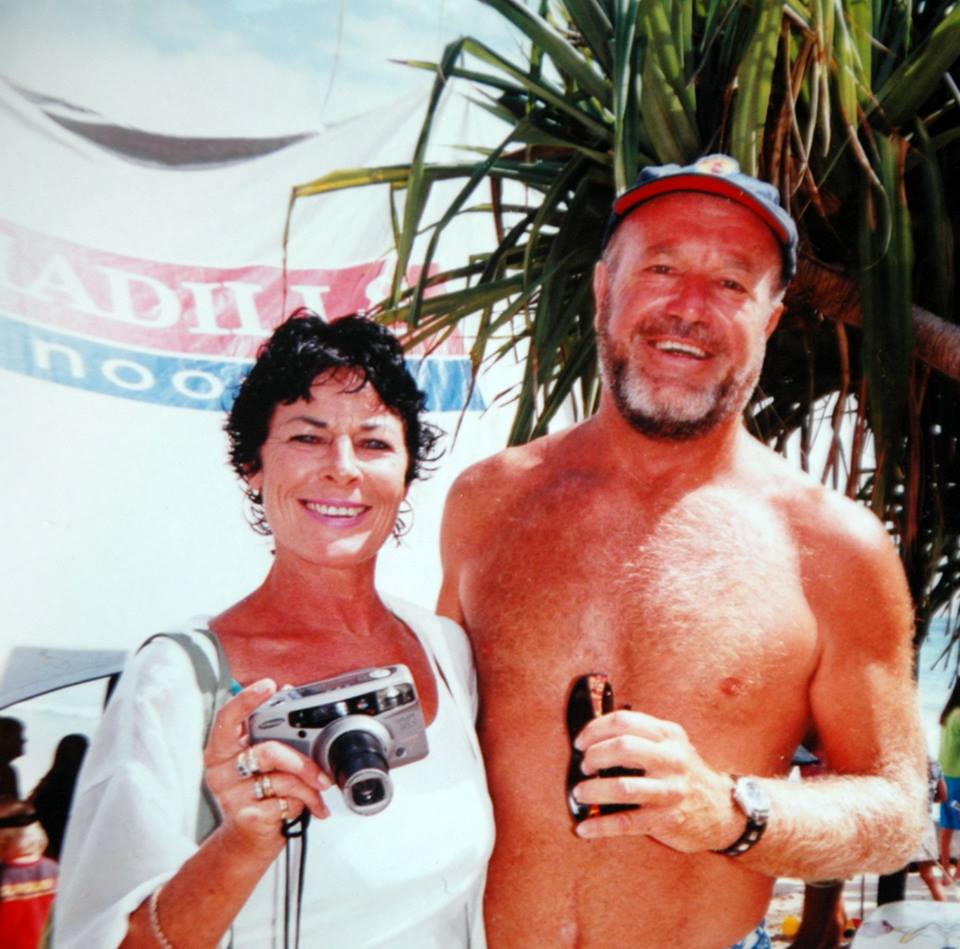 Pearl pictured with former Narrabeen surfer Mick Marlin at the Noosa Festival Of Surfing, 2000.