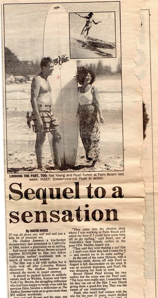 Nat Young and Pearl Turton at Palm Beach last week. INSET: Sixteen-year-old Pearl in action. … IT was all about sun, surf and and just a little bit of innocent sex. The Endless Summer, a low-budget documentary that premiered in California in 1964, turned a generation on to surfing. Surf movie maker Bruce Brown scraped together $US50,000 to film two fellow Californian surfers' worldwide trek in search of waves and women. The film was a hit with surfers but it really took off after Columbia Pictures discovered The Endless Summer and released the movie in major cinemas. It played to packed houses in unlikely venues such as Wichita, Kansas and New York City. Brown, the struggling enthusiast who had been happy to break even with his previous films, became a millionaire as The Endless Summer went on to gross more than $50 million worldwide. Sun and surf Brown and his stars, top surfers Mike Hynson and Robert August, found in abundance as they travelled to …