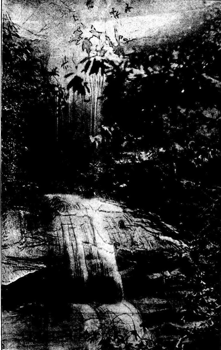 Crossing a bright clear brooklet that ran close to the rear of the tents, a couple of hundred yards brought us to a rocky headland forming the northern boundary of the cove on which the Chinamen were located. This we crossed by a miserable track knee deep in mud, and, arrived on the other side, we had Barranjuee full in front of us, about three quarters of a mile distant, with a long cleared flat, that had the appearance of having been at one time cultivated, lying between us and the mountain. This flat, which now intervened between us and Barranjuee, was scarcely two hundred yards across at the widest part dividing the Pacific from Pitt Water, and joining Barranjuee to the main. It is very low, and is fully exposed to whole sweep of the south-eastern gales that at some seasons prevail upon the coast, throwing up the waves in watery mountains upon the long beach that faces seaward, and scattering the spray in drenching showers right across into the bay. A dense scrub of ti tree and honeysuckle grows on the seaward side of the flat, forming a thick protecting belt almost up to the mountain, and this Nat and I determined to push through, whilst Tom went on ahead to the Customs station, whose white cottage we could see glistening brightly against the dark back ground of the vast cliffs of the mountain.
