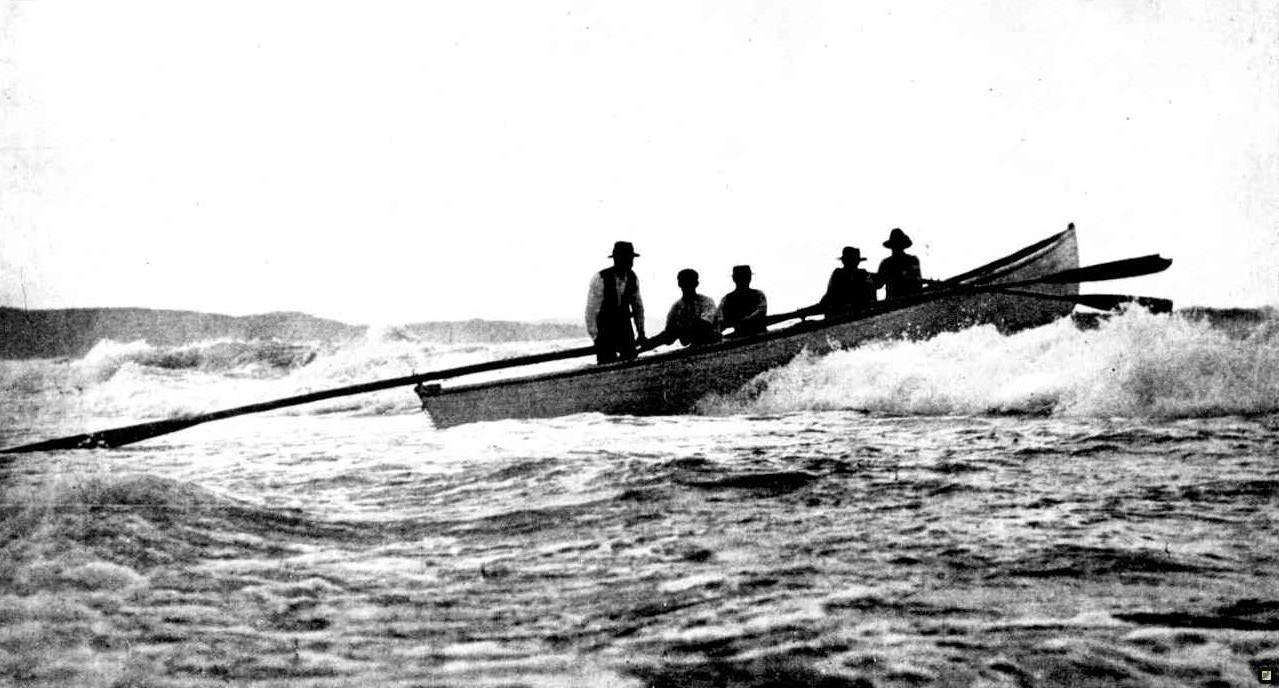 Coxswain, C. Sly; stroke; Alfred Sly; No. 3, Joseph Sly; No. 2, Edward Sly; bow, N. Norgreen. She was launched quite easily, and slid into the water at the willing hands of half a score. The crew rowed her out over the big waves and away to sea with an ease which spoke well for their training and the build of the boat under them.