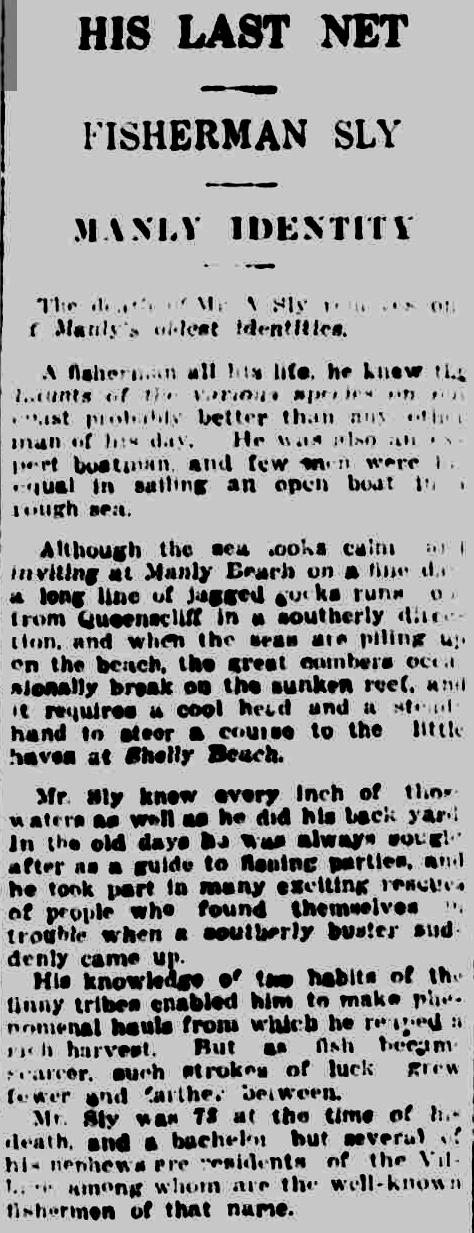 George Sly is of course the father of the Shelly Beach Fairy Bower residents who were responsible for the advent of early fishing boats and whalers being used as rescue boats on Manly Beach, and over a hundred years of surfboat history since...See: Surf Bathing and the Advent of Manly’s First Surf Carnival - 1907