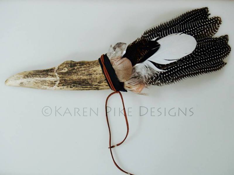 Karen Pike: Hand carved Deer Antler with Rose and Clear Quartz, Guinea Fowl, Cockatoo and Duck feathers, bound in leather.
