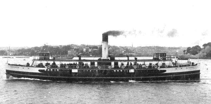 SS Bingarra was a Steel screw steamer launched 1905. 442 tons .Dimensions: 58.00 x 9.00 x 3.25 (metres), Passenger capacity: 1332, Speed: 13 knots. Binngarra was to be the first of ultimately six similar ferries that were to dominate the Manly ferry trade for eighty years. These six vessels would all be built by Mort’s Dockyard and Engineering Company – five at Woolwich and the last at Balmain. The builders had produced other ferries for the Manly trade; these six were to be the penultimate design for an Australian built Sydney ferry.
