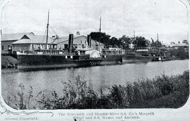 H. R. N. S. N. CO TIME TABLE. STEAM TO SYDNEY From Morpeth, Newcastle. This Thursday, Maitland. noon 5 p.mFriday, Namoi Friday, Lubra (Cargo only)Saturday, Morpeth. Monday, Namoi.Monday, Lubra (Cargo only)Tuesday, Maitland. Wednesday, Namoi.Wednesday, Morpeth. 10 a.m. 11 p.m STEAM FROM SYDNEY EVERY NIGHT, Sunday excepted, Goods for Clarence Town received daily. Deck Cabins, Berths, Saloon, State Rooms, or Reserved Cabins can be secured at once on application at the Company's Newcastle Office, by telegram or letter, to Lochbead and Co., Agents, J. W. LEE, Agent, Morpeth, January 14, 1885. 418 Advertising. (1885, January 15). The Maitland Mercury & Hunter River General Advertiser (NSW : 1843 - 1893), p. 1. Retrieved from http://nla.gov.au/nla.news-article18943196