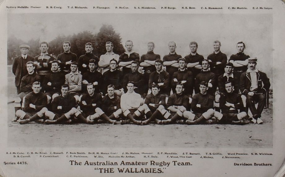 Above: The Australia national rugby union team, tour of Britain, France and North America; newer version of postcard with nickname Wallabies. (1908) - for more see: Davidson Brothers - www.flickr.com/photos/rugby_pioneers/145164414/ and Rugby Historical Society UK - see more on Australian Rugby Olympics Teams HERE and 1908–09 Australia rugby union tour of Britain