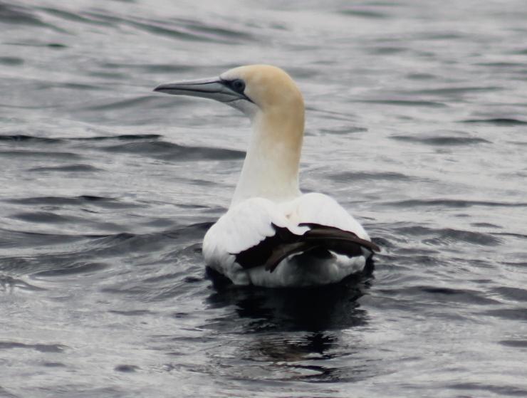 The Australasian gannet (Morus serrator or Sula bassana), also known as Australian gannet and Tākapu, is a large seabird of the gannet family Sulidae. Adults are mostly white, with black flight feathers at the wingtips and lining the trailing edge of the wing. The central tail feathers are also black. The head is yellow, with a pale blue-grey bill edged in black, and blue-rimmed eyes. Young birds have mottled plumage in their first year, dark above and light below. The head is an intermediate mottled grey, with a dark bill. The birds gradually acquire more white in subsequent seasons until they reach maturity after five years.