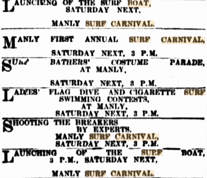 This afternoon the first annual Surf Carnival will be held at Manly, when fancy diving, shooting the breakers, and other aquatic sports will form the programme. Selections will be played by the Manly Band, and there will be a special steamer service. MANLY SURF CARNIVAL. (1907, March 16). The Sydney Morning Herald (NSW : 1842 - 1954), p. 16. Retrieved from http://nla.gov.au/nla.news-article14833502