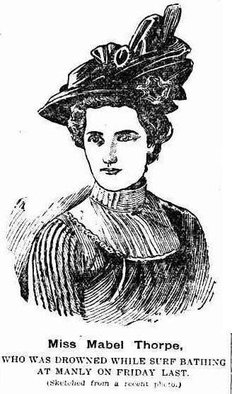Above: Miss Mabel Thorpe, WHO WAS DROWNED WHILE SURF BATHINGAT MANLY ON FRIDAY LAST.(Sketched from a recent photo.)