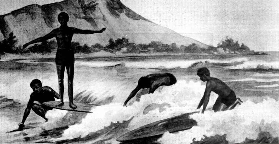 The surf board is another instrument coming more and more into use. You will see men riding the combers on them, some limes standing upright — like bronzed gods of the surf riding the waves— a fine sight!