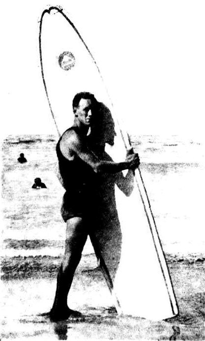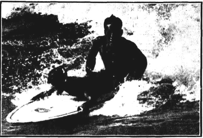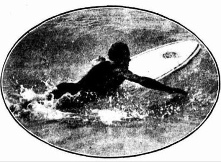 IN a letter to Harry M. Hay, Australia’s foremost swimming and, surf coach, Tommy Walker, one-time surfboard champion at Manly (N.S.W.), writes: 'I saw an article by you in 'The Referee' re surfboards. so enclose a photo of myself and surfboard taken in 1909 at Manly. This board I bought at Waikiki Beach, Hawaii, for two dollars, when I called there aboard the 'Poltolock.' I won my first surfboard shooting competition at Freshwater carnival back in 1911,and that wasn't yesterday. Regards.'