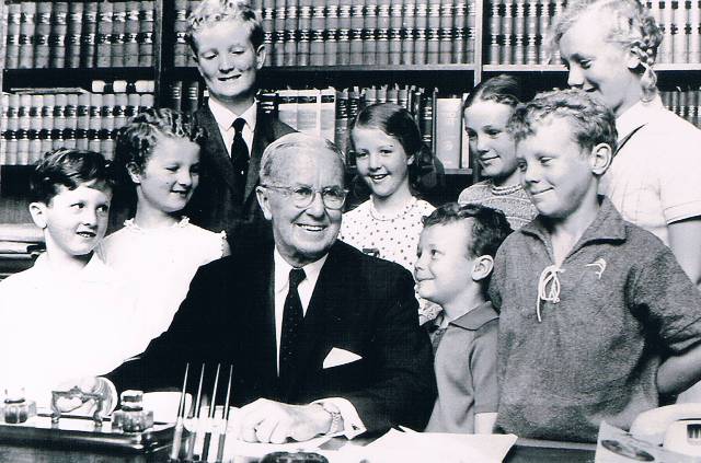 In 1972, as is required by law, Adrian at 70 retired from the District Court Bench. Here he is seen surrounded by his eight grandchildren.