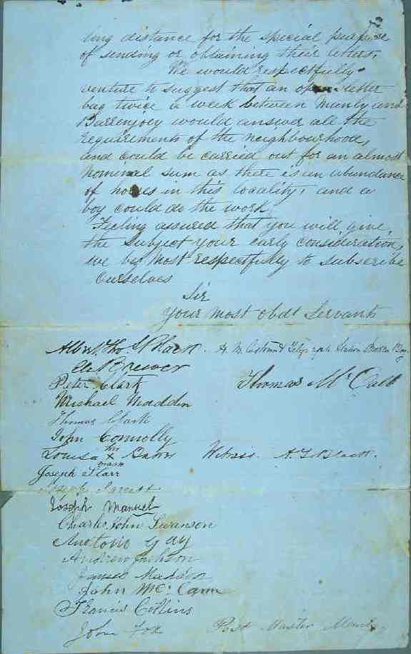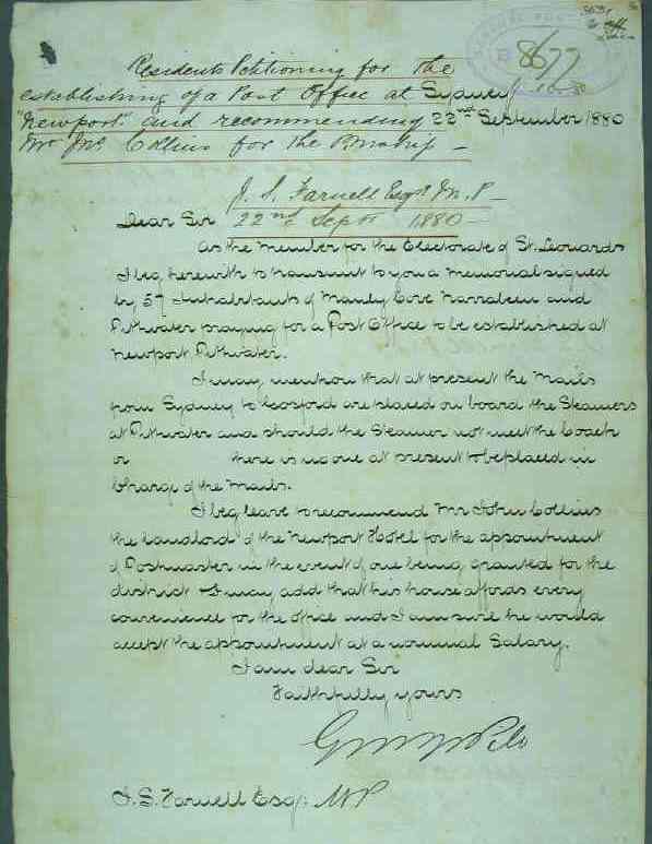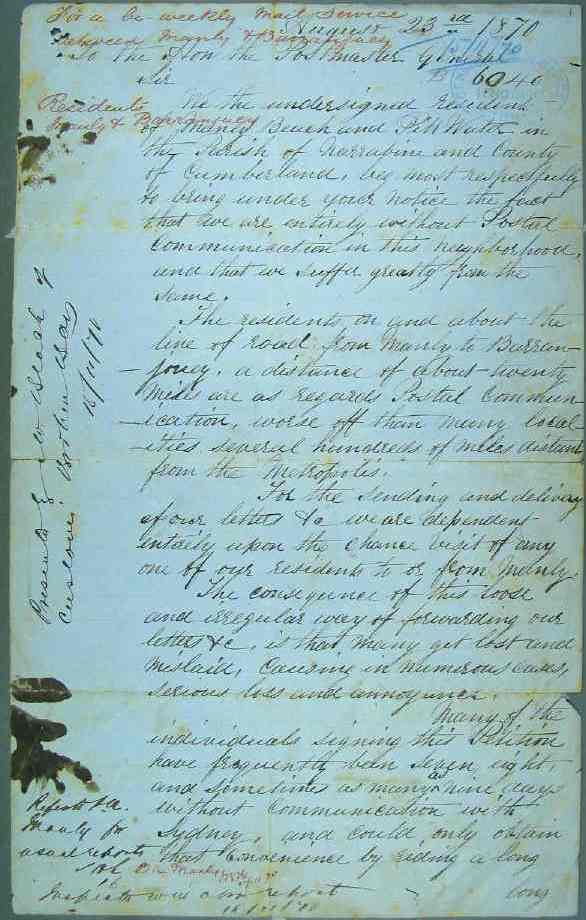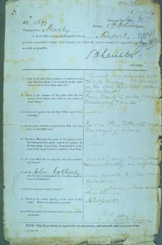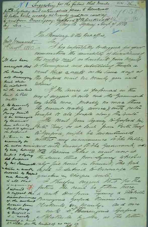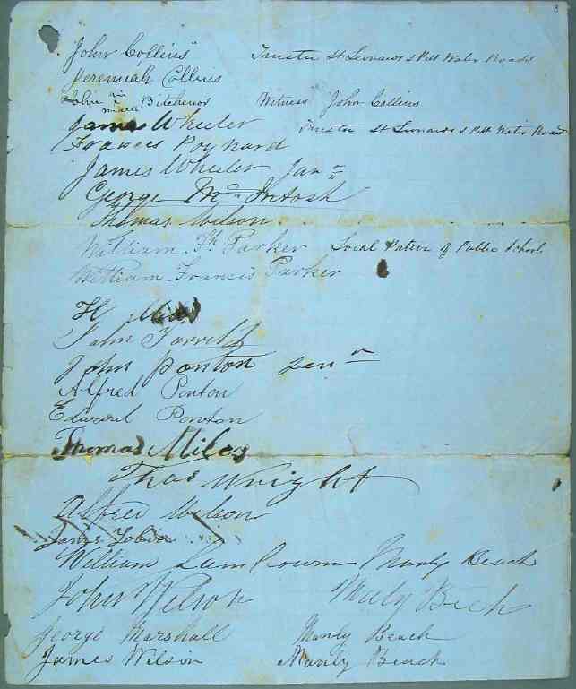 On 23 August 1870 many of the residents between Barrenjoey and Manly signed this letter we found in the Australian Archives, a petition for a biweekly mail service between Manly and Barranjoey. The petition was presented on 15 November 1870 by Mr Black of H.M. Customs and Telegraph Station, Broken Bay.