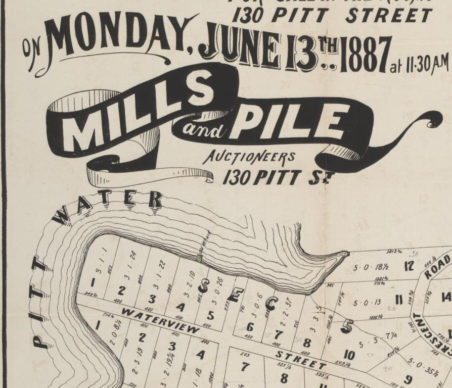 Old Wharf shown on Mona Vale, Pitt Water [i.e. Pittwater] [cartographic material] / for sale in the rooms, 130 Pitt Street on Monday June 13th 1887 at 11.30 a.m., Mills and Pile, auctioneers, 130 Pitt St. MAP Folder 103, LFSP 1553. Courtesy National Library of Australia.