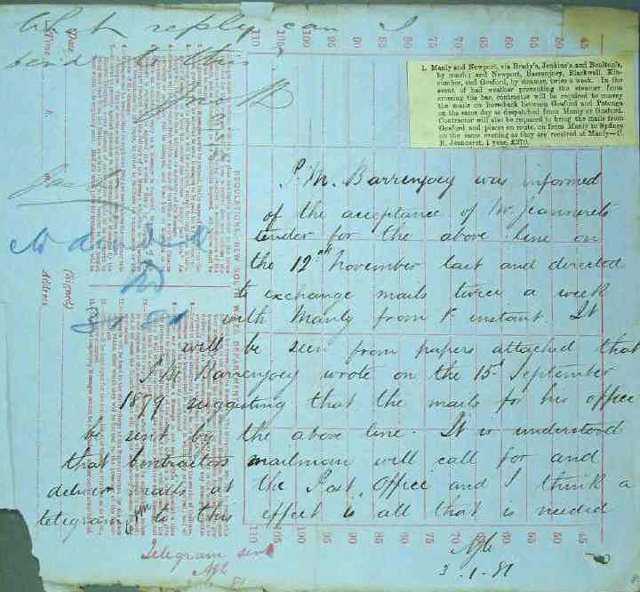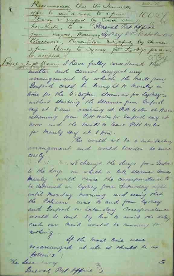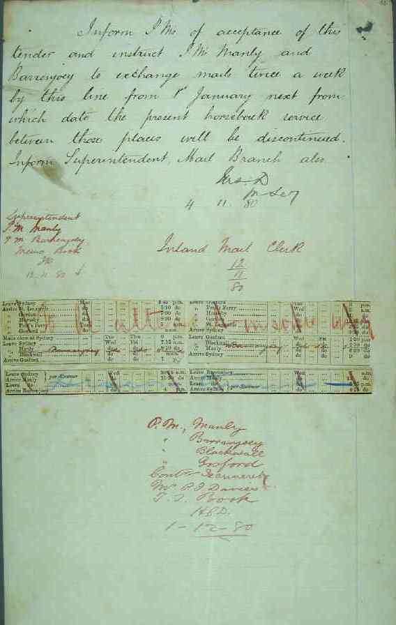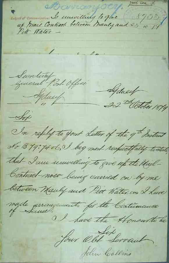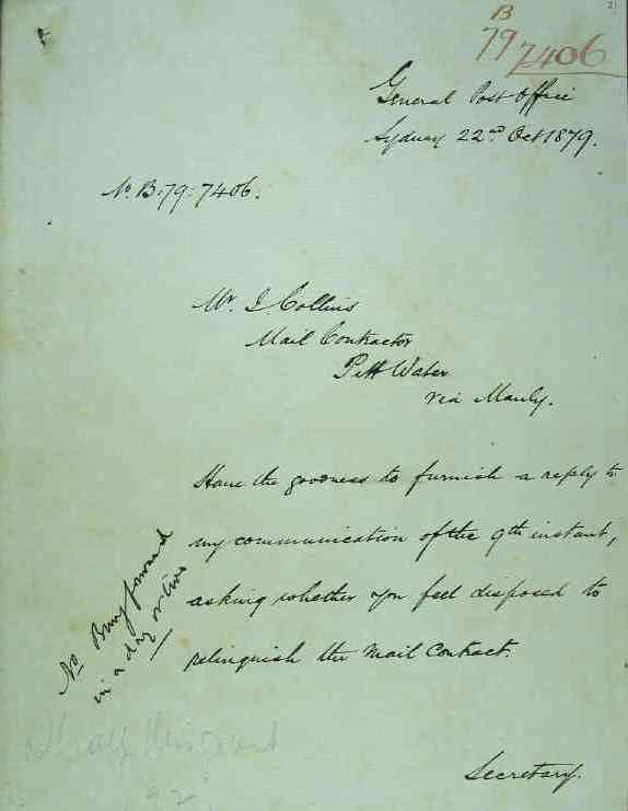 GOVERNMENT MAIL NOTICES. General Post Office, Sydney, 29th October, 1874. IT is hereby notified, that the following Tenders for the Conveyance of Mails from 1st January next, have been accepted. Manly and Barrenjoey, via Brady's, Jenkins', Wilson's, and Collins', once a week-John Collins, horseback, 3 years, £32 per annum . Advertising. (1874, October 30). The Sydney Morning Herald(NSW : 1842 - 1954), p. 6. Retrieved from http://nla.gov.au/nla.news-article13342493