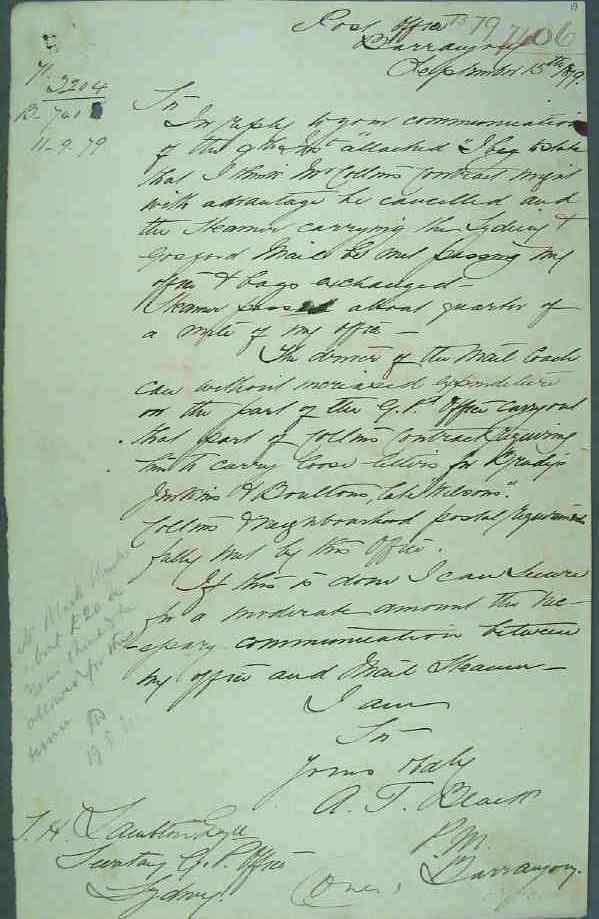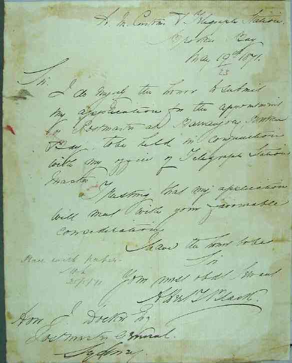 The establishment of a mail service to Pittwater began by the presentation of a petition signed by those who lived here. As early as May 1871 Mr. Black of the Customs Station offered to take on the duties as Postmaster at Barrenjoey. (see Letter below):