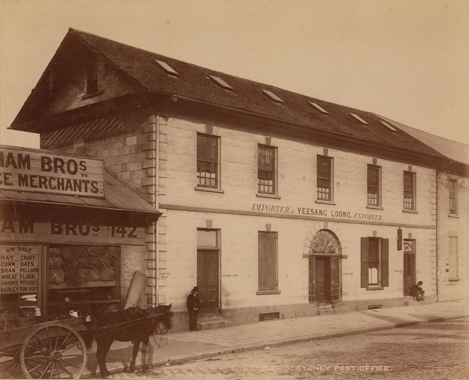 The first Sydney Post Office : The Post Office operated from the home of the first postmaster, Isaac Nichols, in lower George Street. This photograph was taken a few years before the building was demolished in 1889. Image No.: a089288, courtesy State Library of NSW