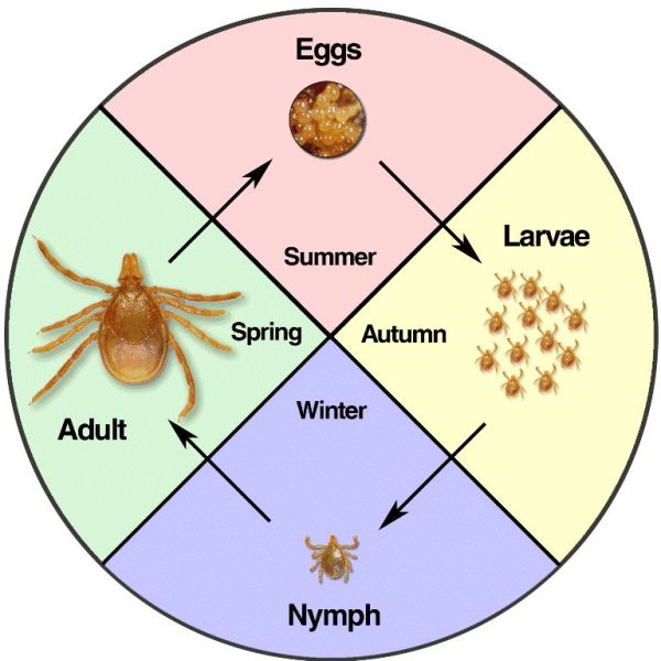 Tick stages are seasonal, with larvae active during the autumn, nymphs in winter, and adults in the spring.