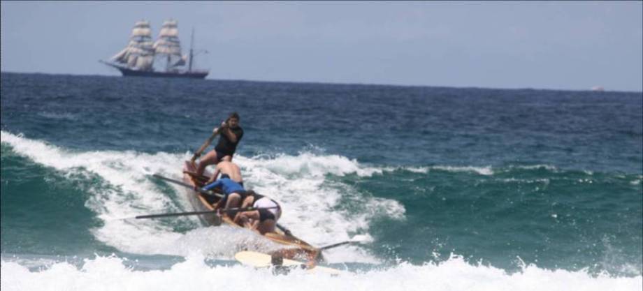 First wave after expensive restoration! Nathan Perry builder of modern surfboats shows his sweeping talent extends to wooden surfboats from his apprenticeship days. Nice of the ‘James Craig’ to pose in the background!