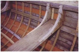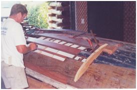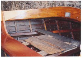 Glen Myers restoring boat. New timbers are purposely highlighted to maintain integrity. Bow box left in original state in restored boat.