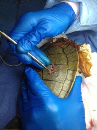 He put her under General Anaesthetic and began cleaning and debriding the wound to reduce infection. He then set about lifting the crushed section to reduce the pressure on the underlying tissue. Then he pieced the bits of the carapace back together with steri-strips and Tincture of Benzoin - like a puzzle. She was given antibiotic injections to reduce the likelihood of infection and some pain management.
