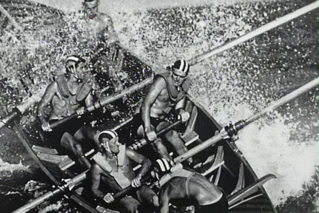 The five men in the surf boat were: W. E. Sweetapple, R. Gurney, J. Kraefft, M. Hall-Dcst, R. Butler. All are in their early twenties.