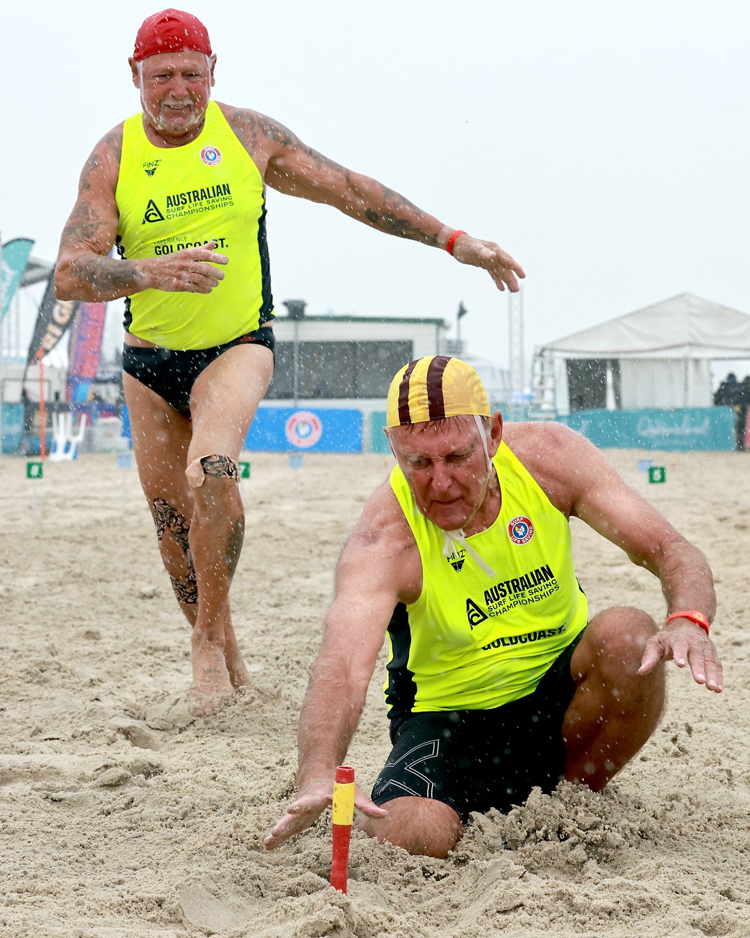 The Grandfather of them all, Ted Smithies of Newport, took Gold again this year in the 75 yrs & Over Male Beach Sprint with Robert Tomblin of Collaroy winning the Bronze, backing that up with another Gold in the 75 yrs & Over Male Beach Flags while Robert Tomblin bettered his sprint final through securing Silver behind Ted.