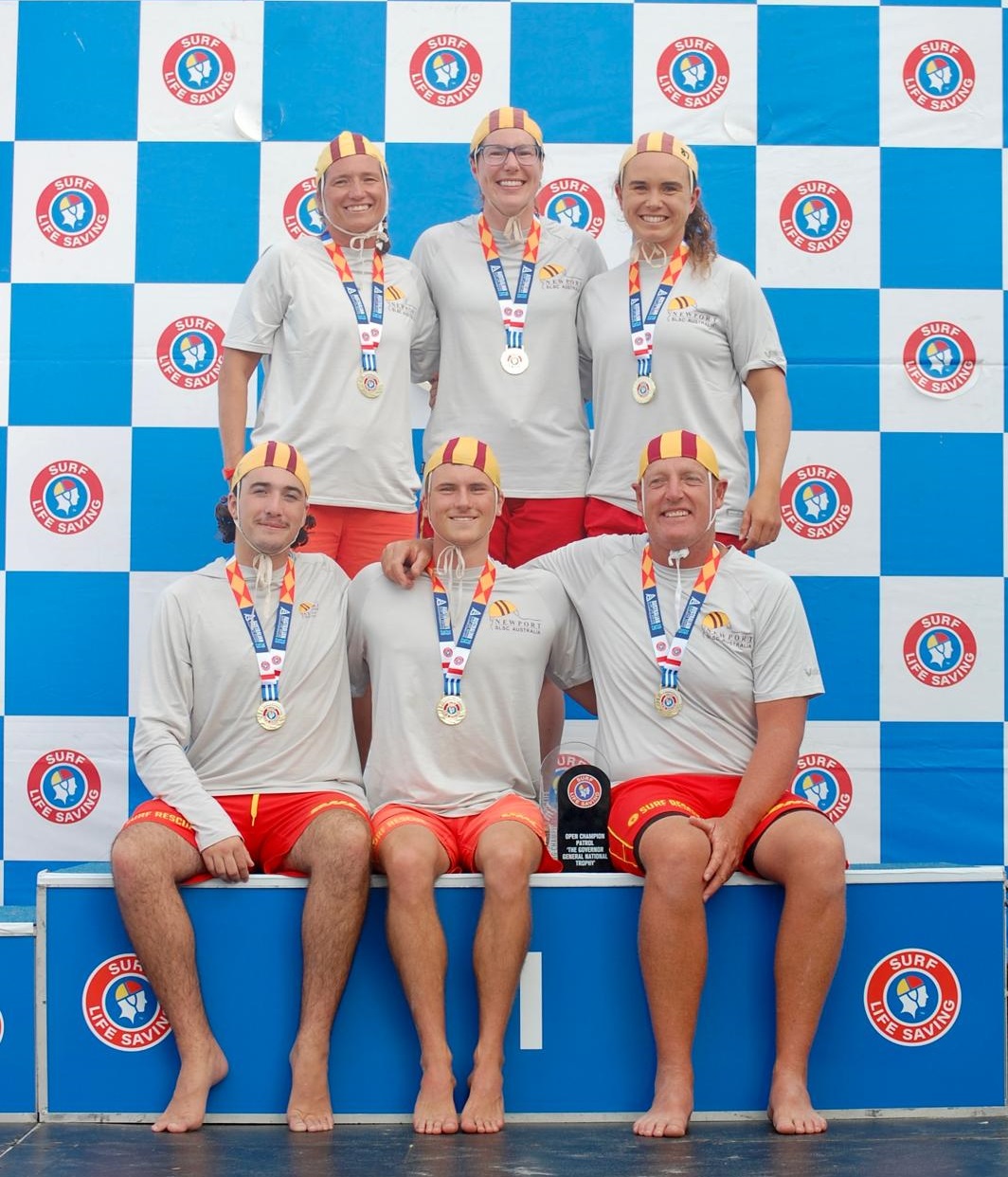 Newport SLSC Open Team won 4th place this year, with 174 points and 11 Gold, 11 Silver and 5 Bronze medals, which included taking out the all important Open Patrol Competition with both the President Rebecca Capell and Vice President Guyren Smith on the winning team. Guyren also won Silver in the Champion Lifesaver competition on the first day of competition.