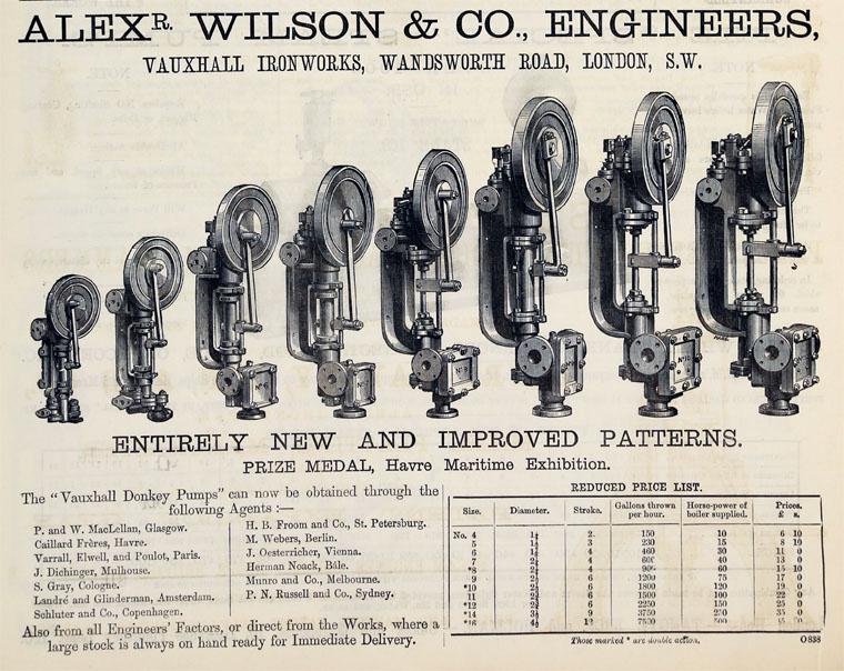 Mr. Wilson was also prepared to undertake any other engineering proposition which interested him and he had early ideas on accident prevention; his 'Excelsior' steam driver: pump, of horizontal design with valve gears operated by triggers at each end of the power stroke, had no unprotected moving parts.