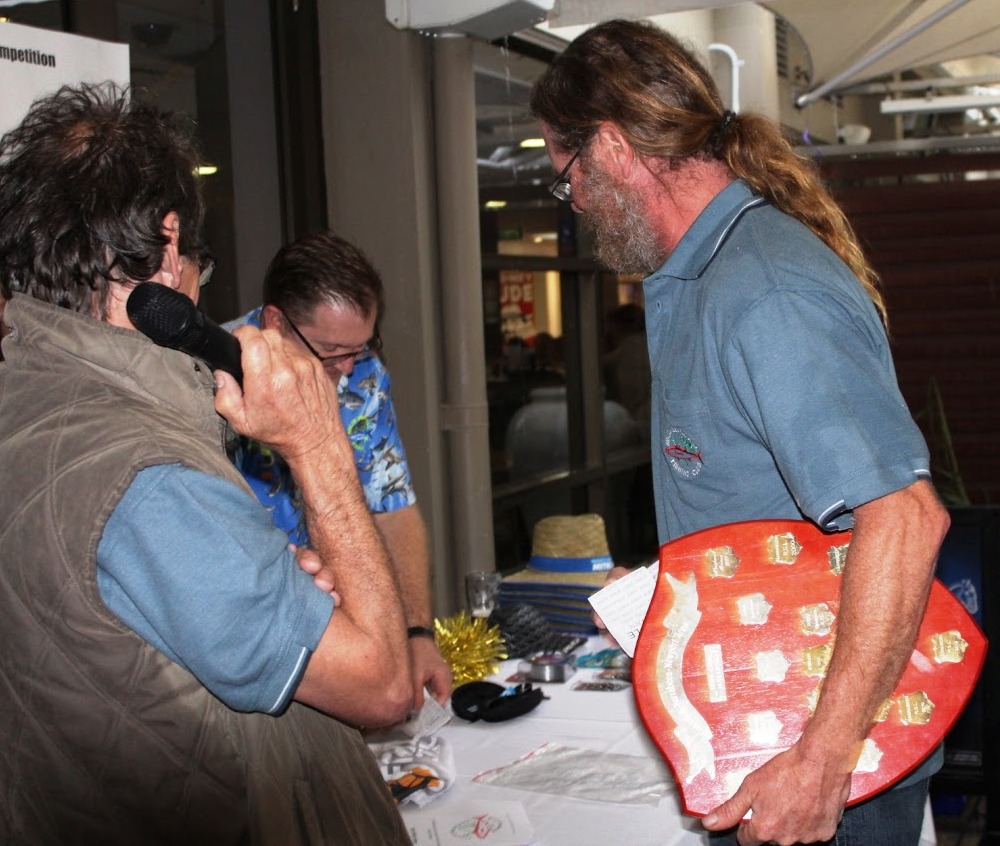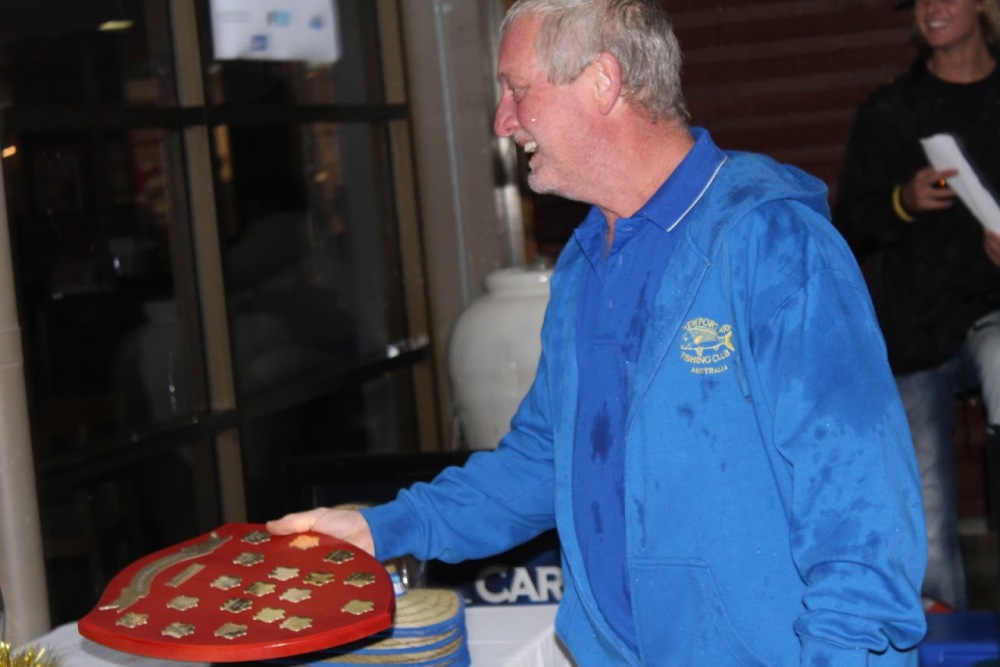 Narrabeen RSL Fishing Club wins the 2016 shield, with the hoots and cheers beginning as soon as second place is announced. This marks the 12th time this club has won the Inter-club competition since the Comp. began in 1998. Mr. Steve Law, President of the club, is pretty darn happy, along with his cheering and jumping around fellow Narrabeen fishers.