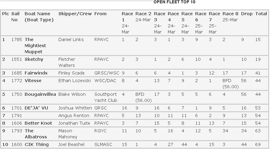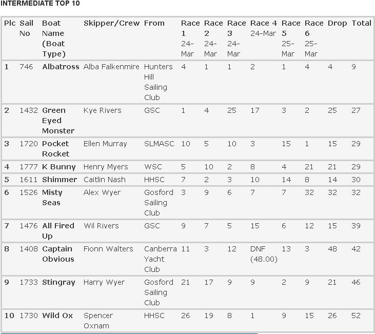 In the Intermidate Fleet Alba Falkenmire has take a clear lead ahead of the pack on 8 points after 4 races, in second is Caitlin Nash on 22 points.