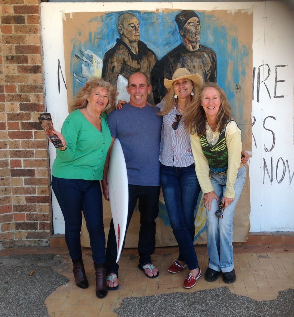 Live mural painting was just one of the features of the 2017 Sculpture Trail. Pictured are, co founder Patsy Clayton-Fry, surfer and writer Nick Carroll, painter Christina Ambrose-Keyes and curator Christine Simpson.