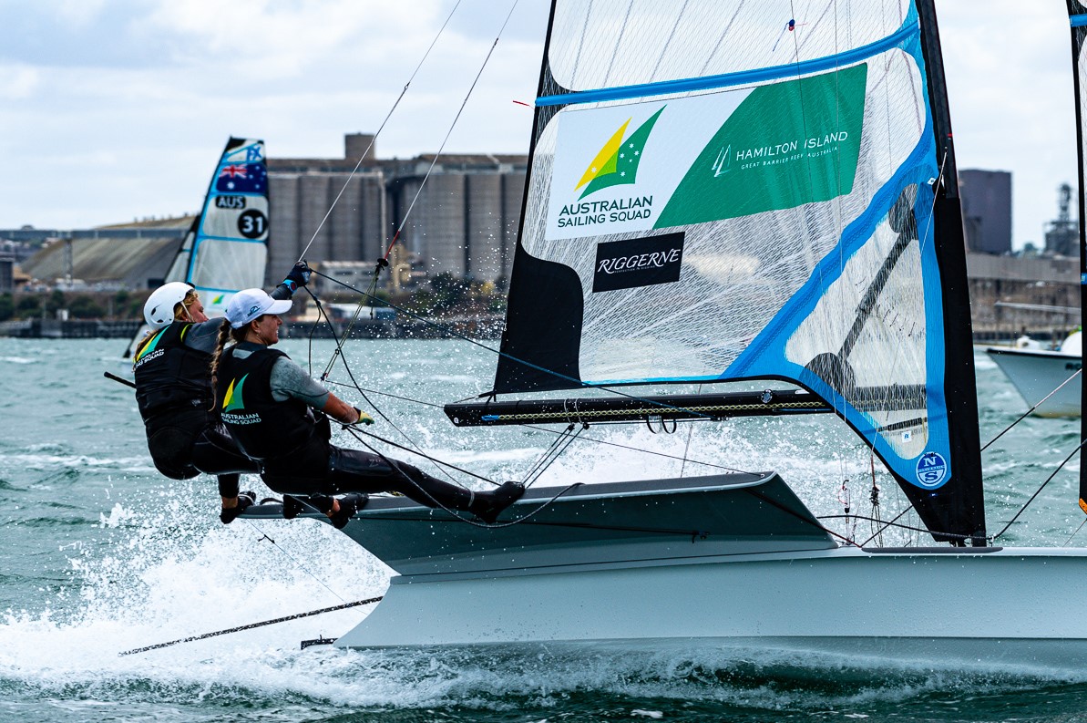 Tess Lloyd and Jaime Ryan aboard their 49erFX are a relatively new pairing at barely 18 months.Long time skiff sailor Lloyd and ex-470 crew Ryan have combined well, both collectively as a crew and on the scoreboard during their somewhat short tenure.