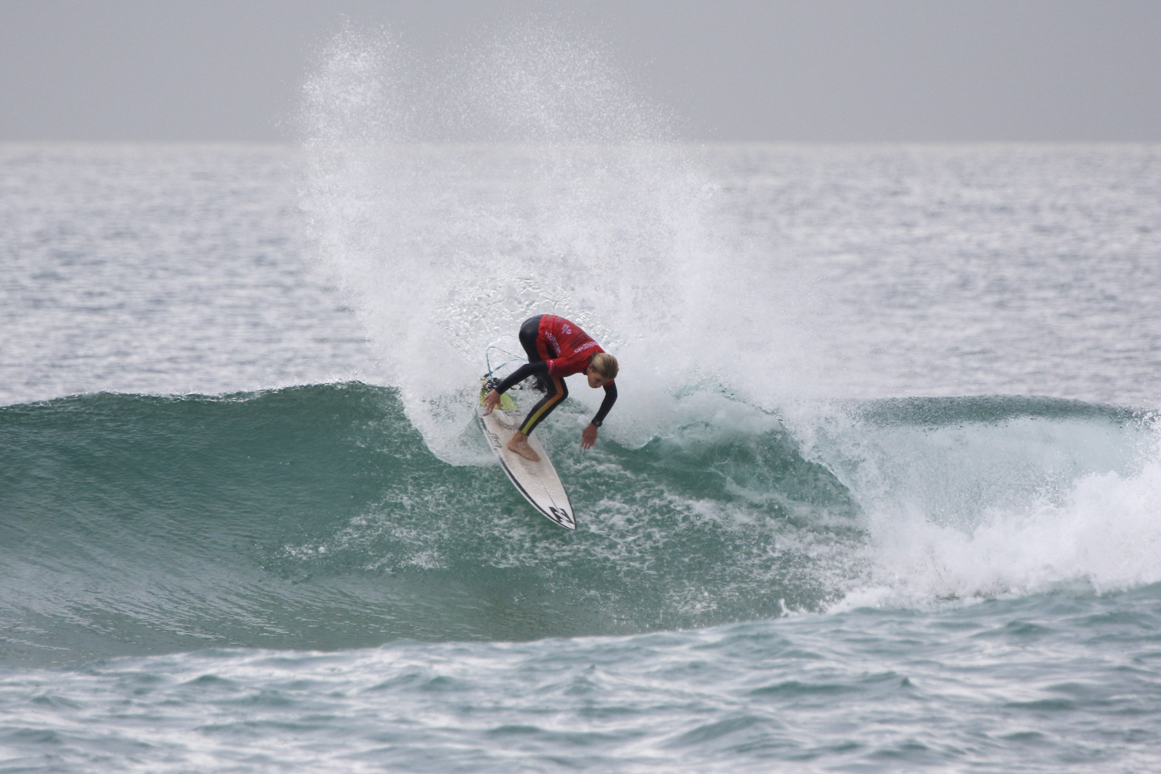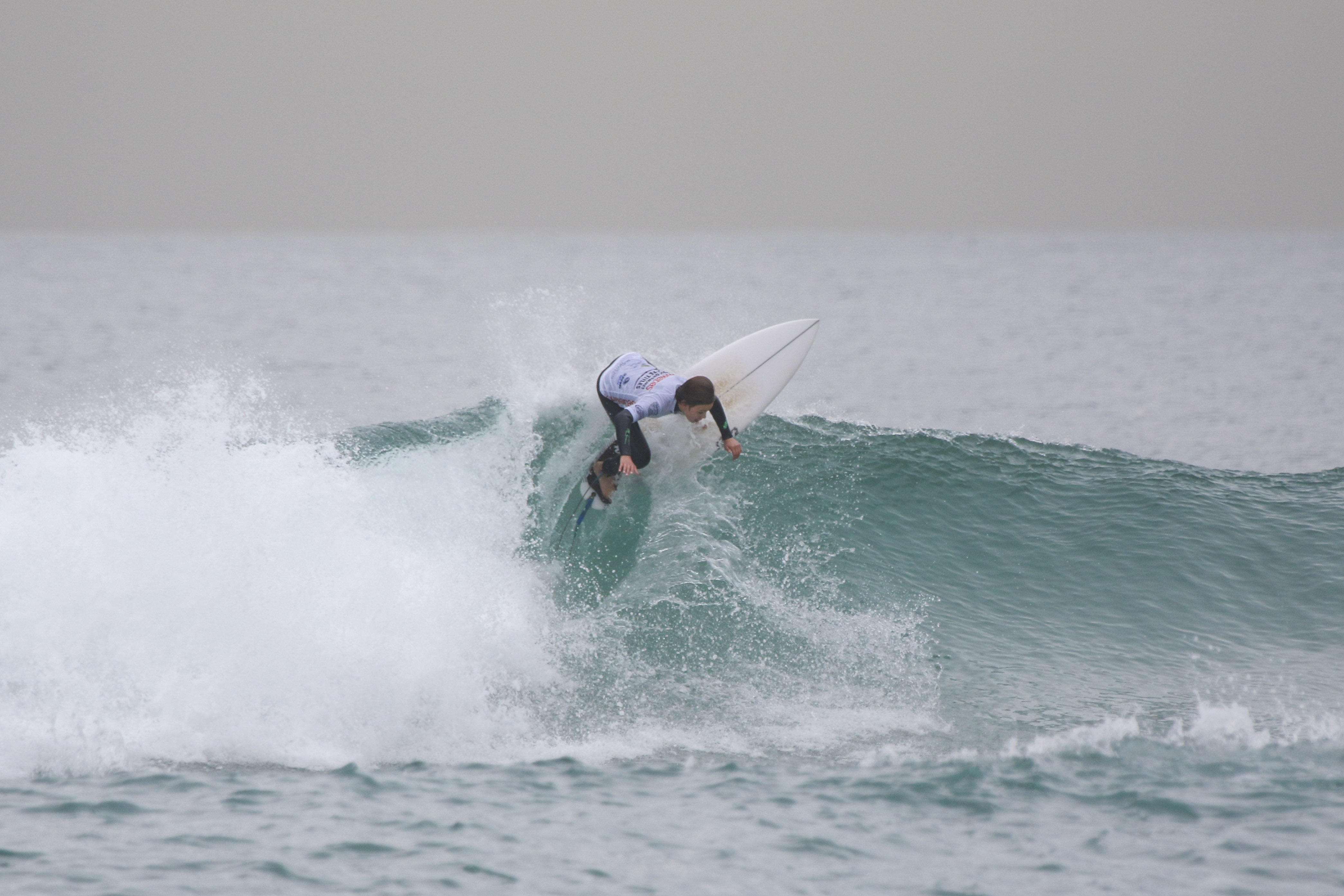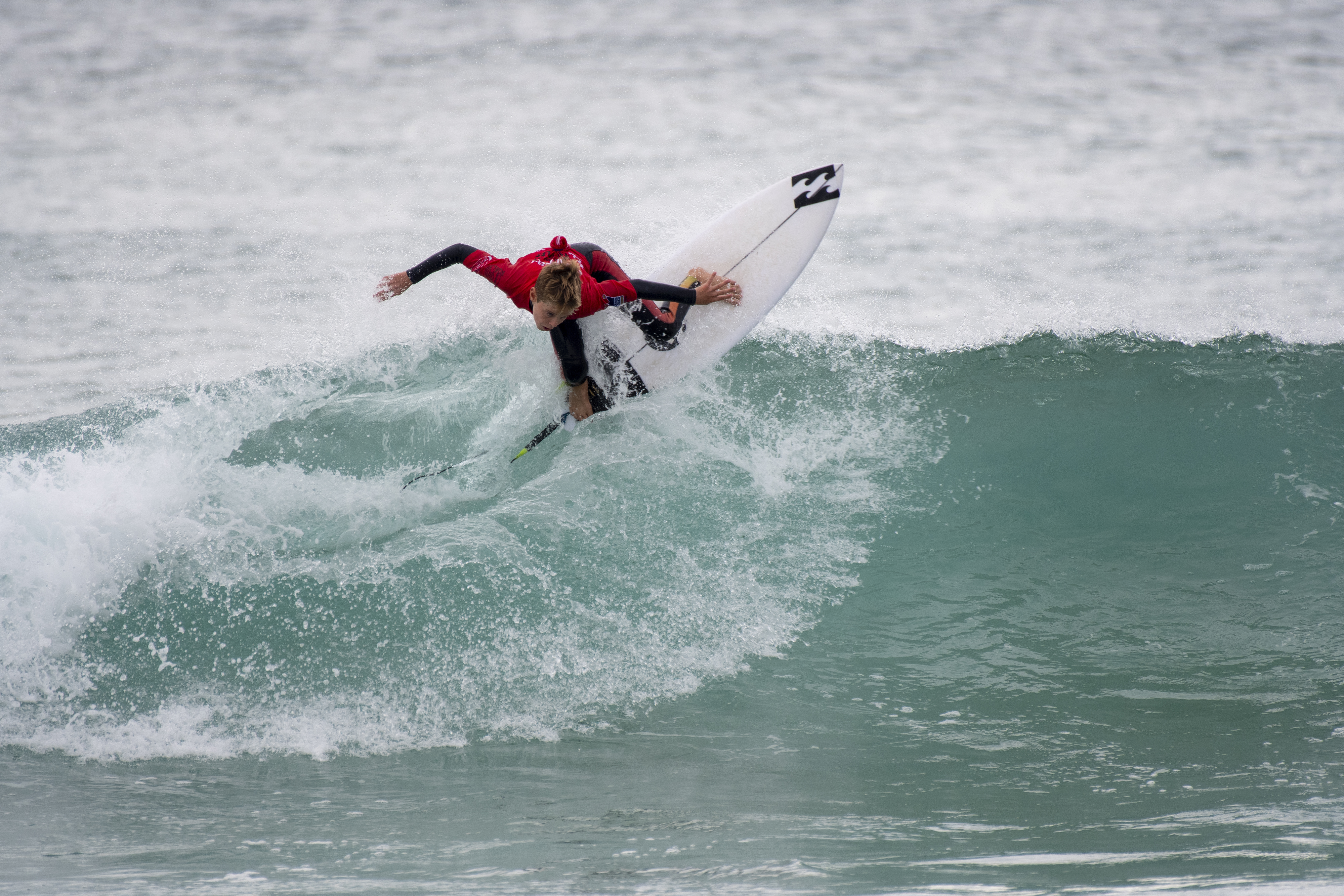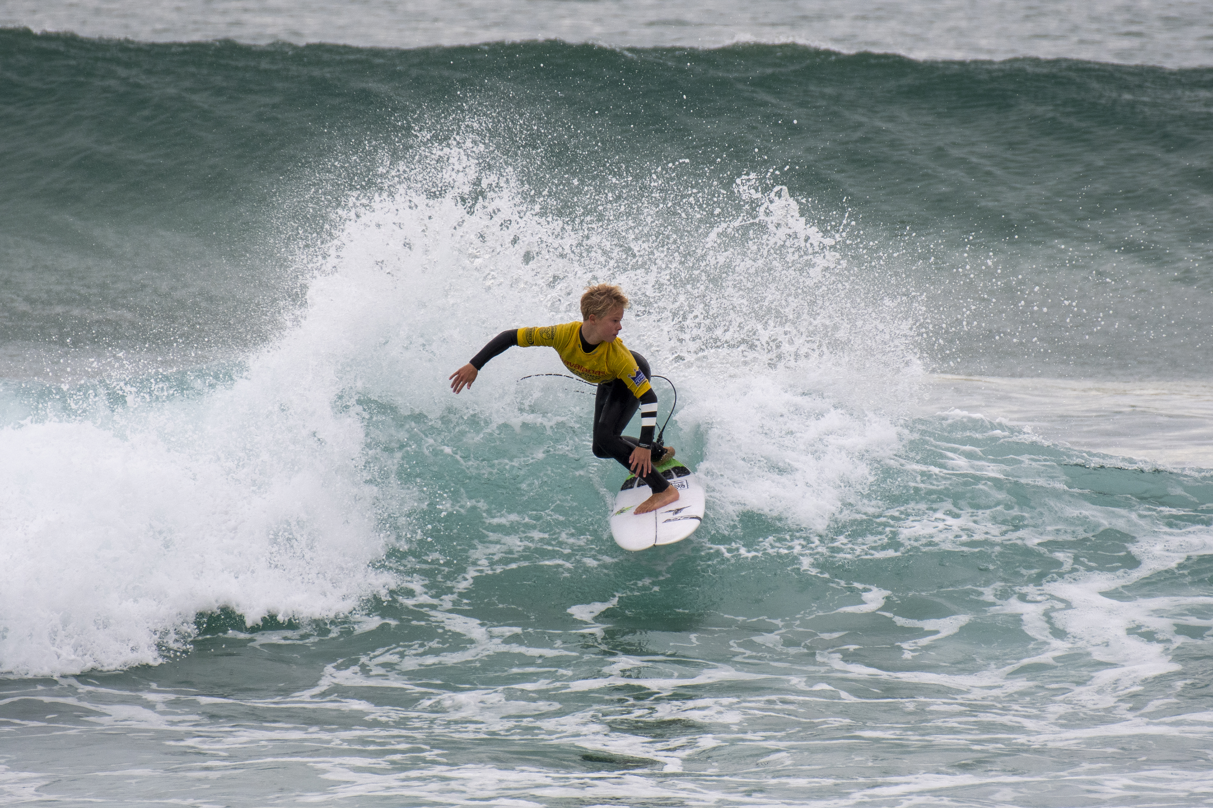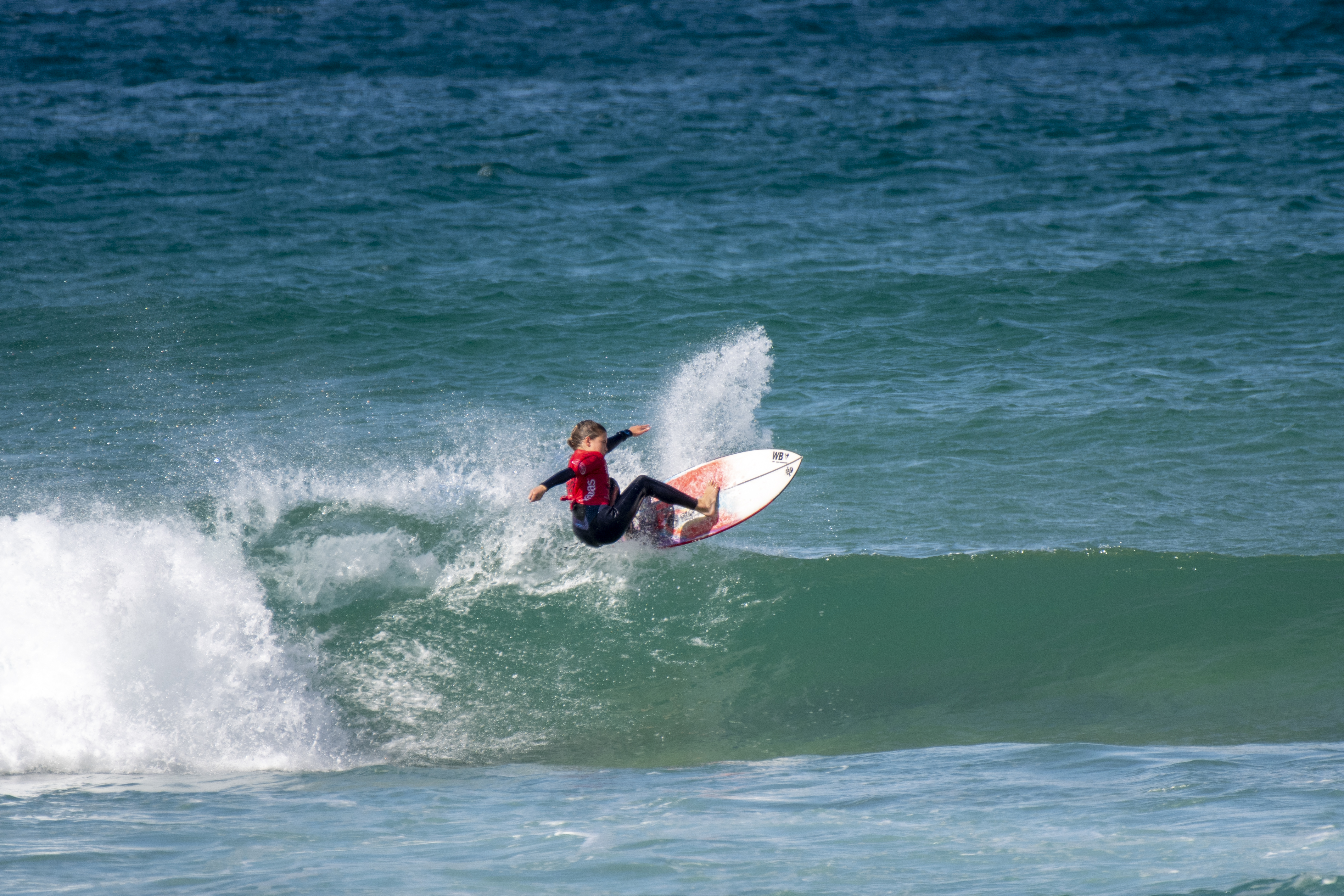 Felix Byrnes (Merewether) synced his powerful forehand attack with the lefthanders on offer, nailing an eclectic mix of carves and snaps to post a respectable 13.57 two-wave heat total and seal his position into next round of the Under-14 Boys.