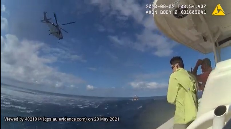 On the morning of Sunday August 2nd 2020 in the South Passage Bar, Moreton Bay, QLD. Samuel and Andrew Coronis were returning to Brisbane in their fishing vessel. Conditions were 2.5-3m swells and approximately 12-15 knot winds. In the process of returning home, Samuel and Andrew discovered a semi-submerged vessel with its bow out of the water, they found a male and female in distress as well as their canine companion. Samuel called triple zero as Andrew manoeuvred the vessel closer to the persons in the water. Samuel instinctively dived into the water with two life jackets and swam towards them.