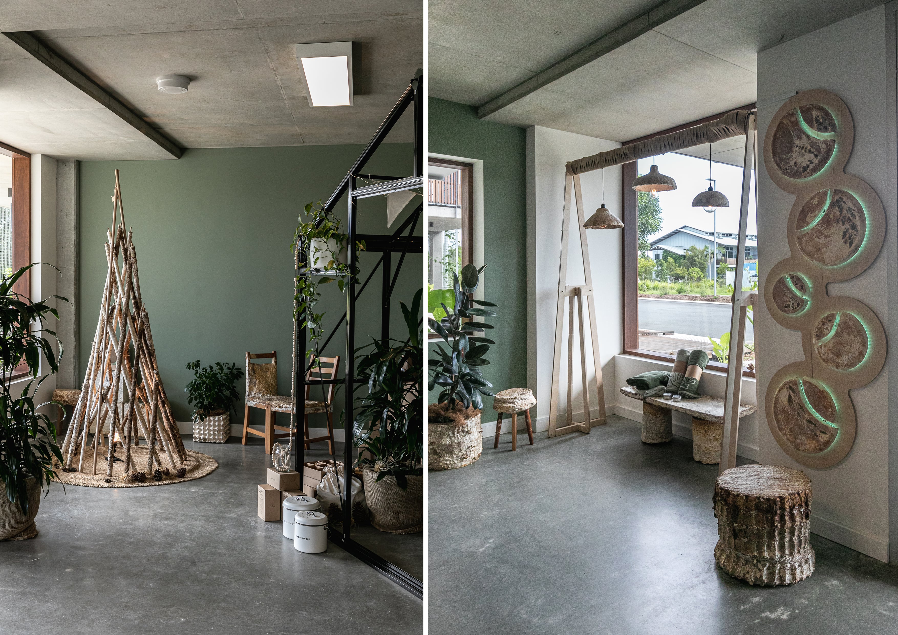 ● Made + Mycelium: Bio-fabrication Based Upcycling - Made+Mycelium is a pop-up store designed for eco brand Seed&Sprout, featuring a series of furniture and functional objects grown with mycelium (root structure of fungi). Reflecting the company’s sustainable ethos and emphasis on product life cycles, mycelium objects were designed and grown by upcycling daily household items and discarded objects.