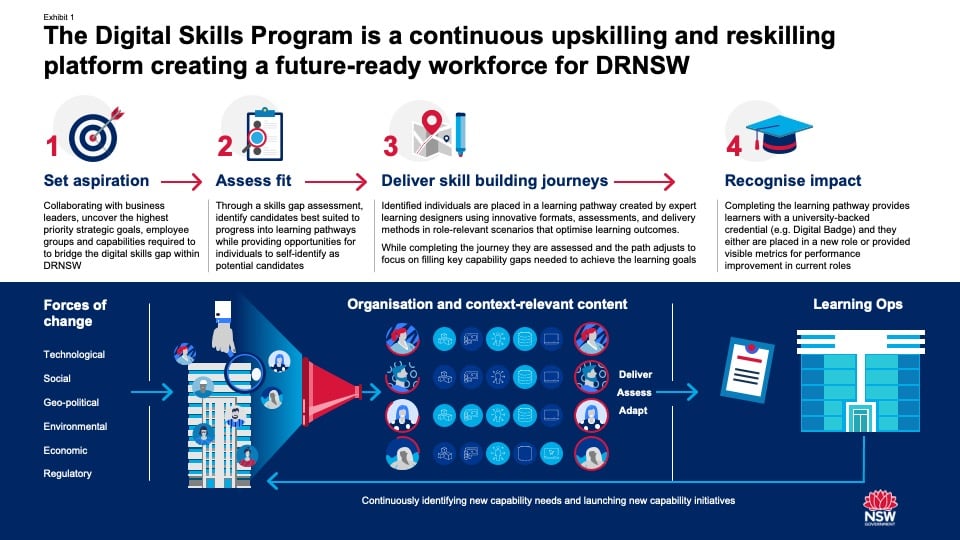 ● Digital Skills Program - Building the Department of Regional NSW’s future-ready workforce - By 2030, McKinsey estimates 5 million Australian jobs will be significantly disrupted due to technological, societal, and environmental shifts. NSW Government believes developing a future-ready workforce and skills-based economy is critical to regional NSW. In response, DRNSW has co-designed, piloted and is now scaling an innovative workplace skill building program.