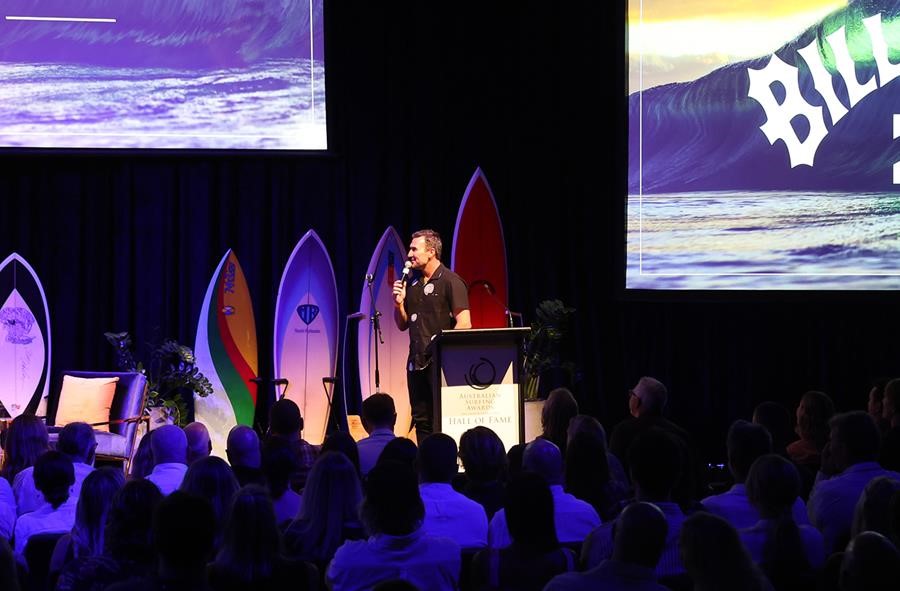 Joel Parkinson on stage as part of his Australian Surfing Hall of Fame presented by Billabong induction. Photo: Surfing Australia