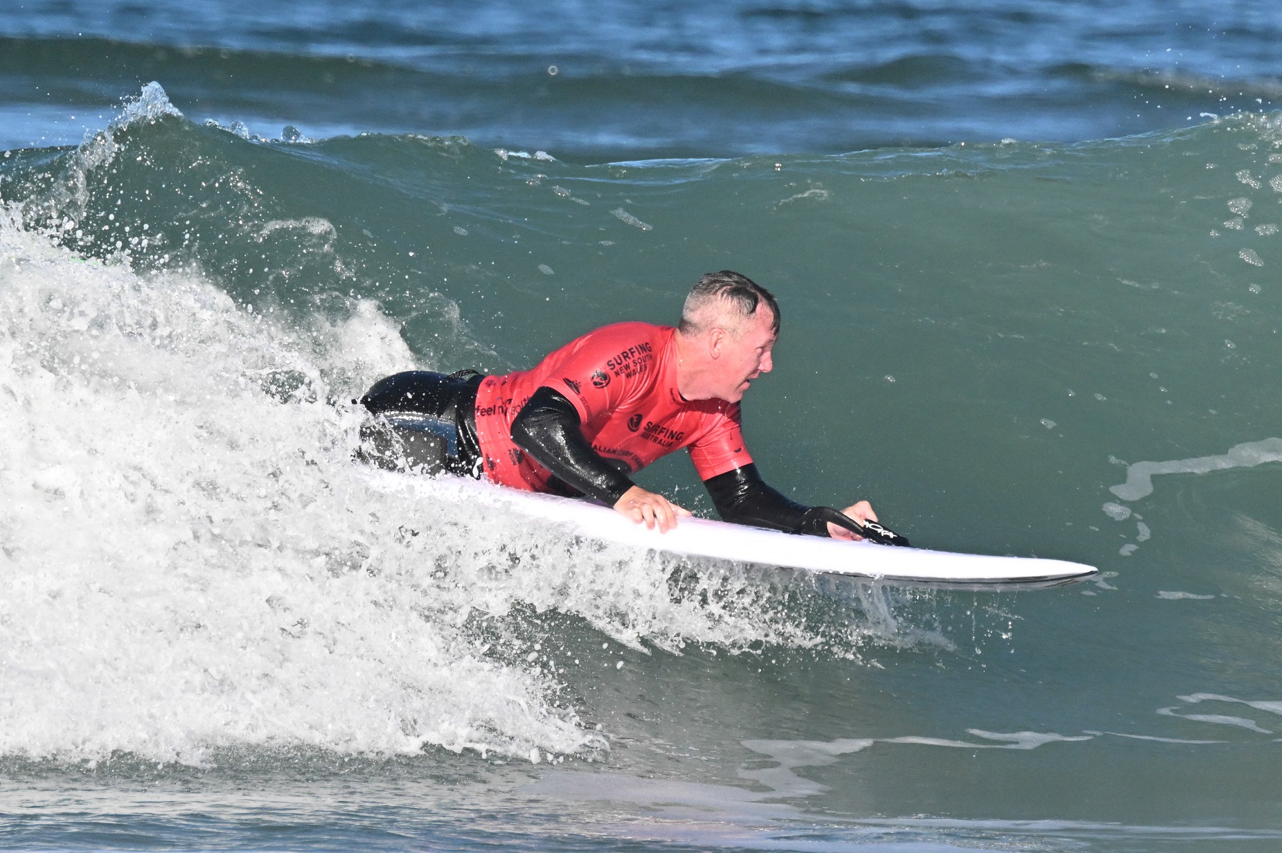 Lee Ferrier (NSW) continued the impressive surfing in the Mixed Prone 2 division to wrap up the day. Ferrier opened the heat with a huge 9.25 using the face of the wave to generate speed and manoeuvres with precision.