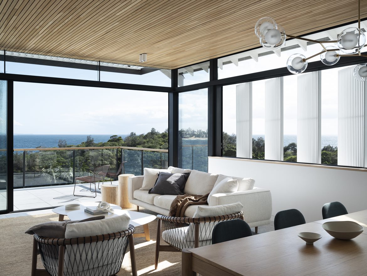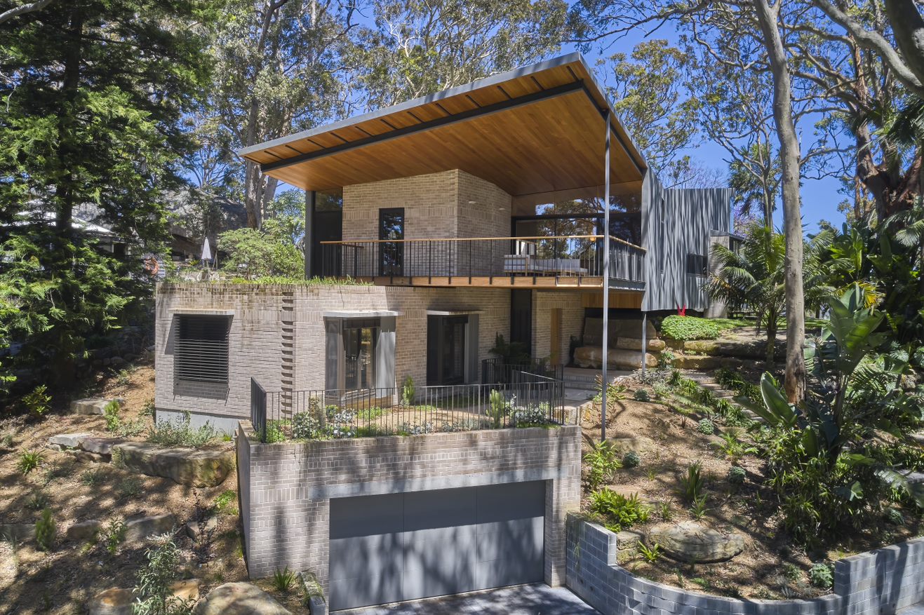This new house on an elevated site enjoys sunrise-to-sunset aspects and filtered views through the tree canopy to the Pacific Ocean and Pittwater.