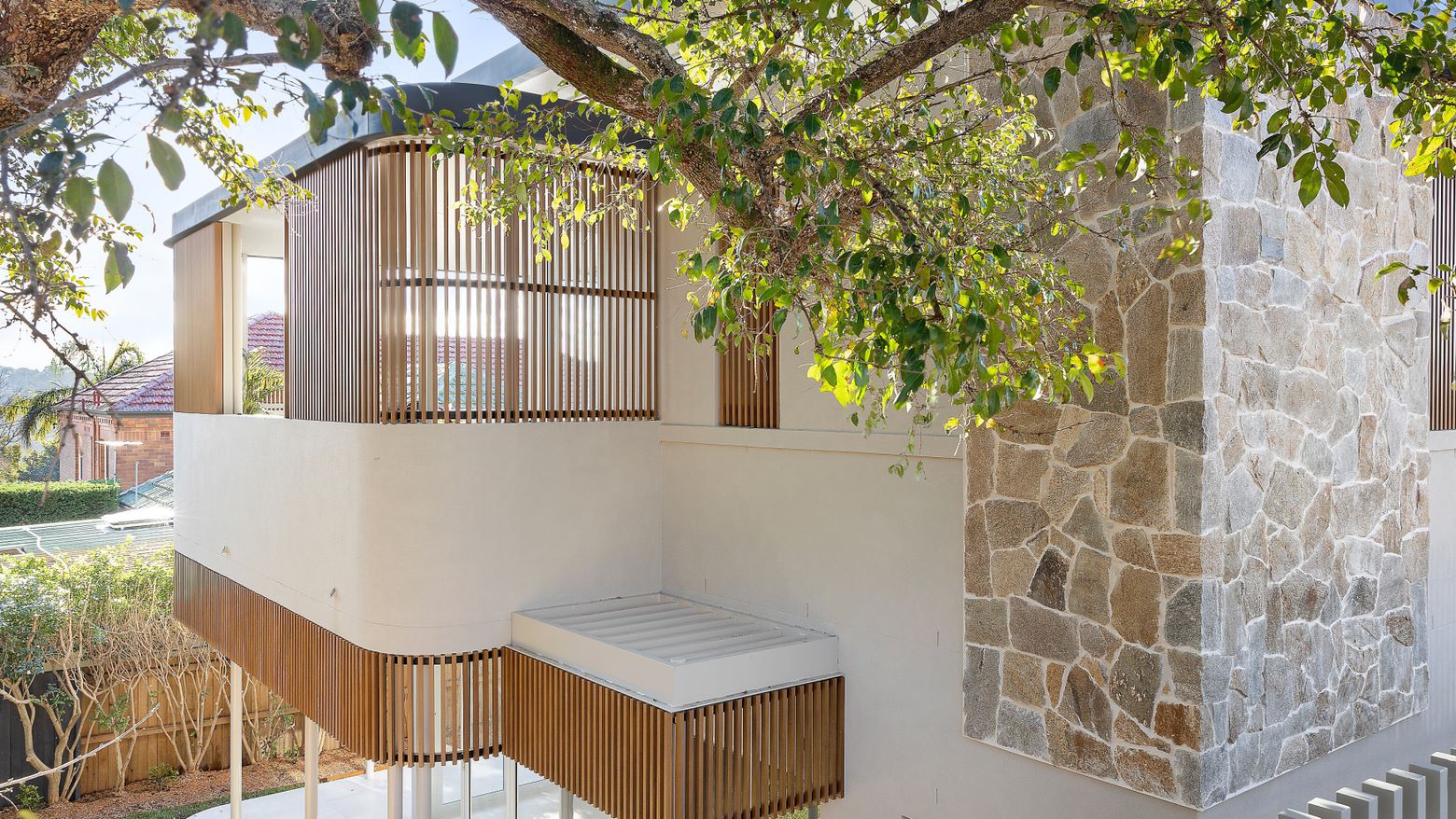 The building reflects the surrounding mid-century housing, with a hint of Art Deco, curved forms, circular roof openings over balconies. The north unit slants back in deference to the public space and view corridor adjacent. It curves around at the end like the bow of a ship, with a fin off one side for privacy to neighbours below and shielded by battens from those above. The ground floor is below street level,behind an old sandstone retaining wall. Small casual living areas open up to blend with the patios and connect to the gardens. The footprint is limited but the ceilings are high for volume and light, like the doubleheight banks of glass louvres at the entry. There is connection to site, views, neighbourhood and family.