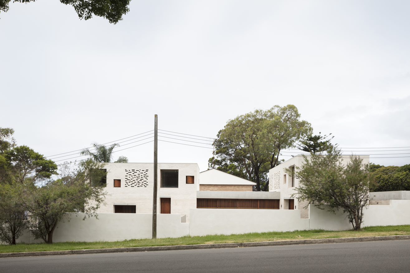 Curl Curl House is a walled garden house that feels calm, confident, and quiet. Its twin sentinels peer above their fence line, partly visible between green.