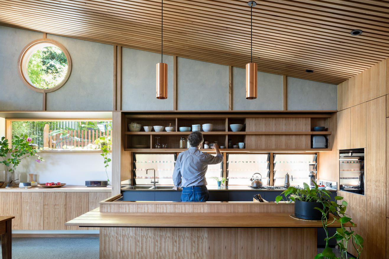 The lower level is embedded into the earth with brick walls and concrete floors. The elevated living area is enveloped in a lightweight structure featuring beautifully detailed Australian Hardwood timbers, and is topped by an east-west butterfly roof.