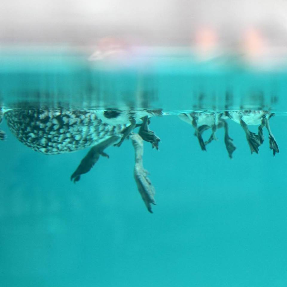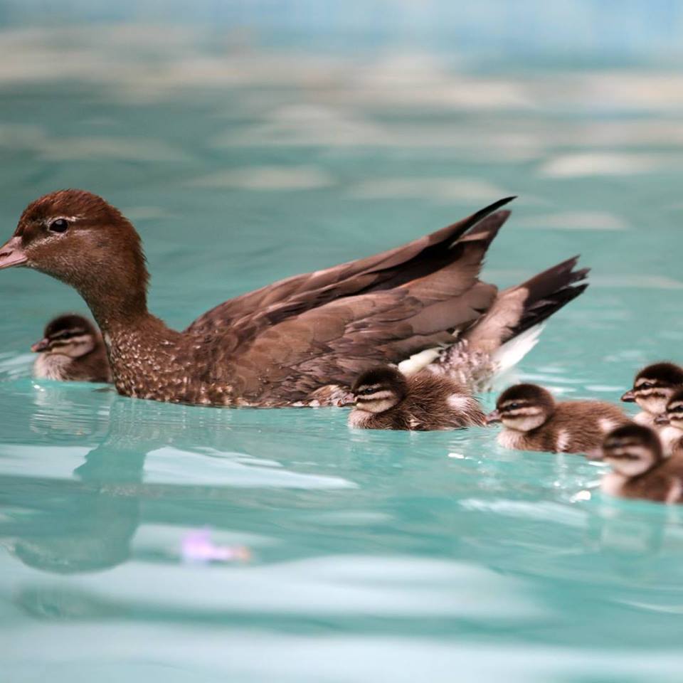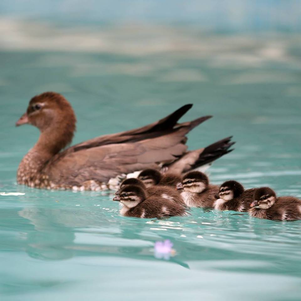 Once the ducklings are ready to leave the nest, the female flies to the ground and the duckling will leap to the ground and follow their parents. Like other waterbirds, the Australian Wood Duck hatches with a covering of waterproof down and can enter the water almost straight away. Both parents feed young and the juvenile ducklings will remain with their parents up to a month after fledging.