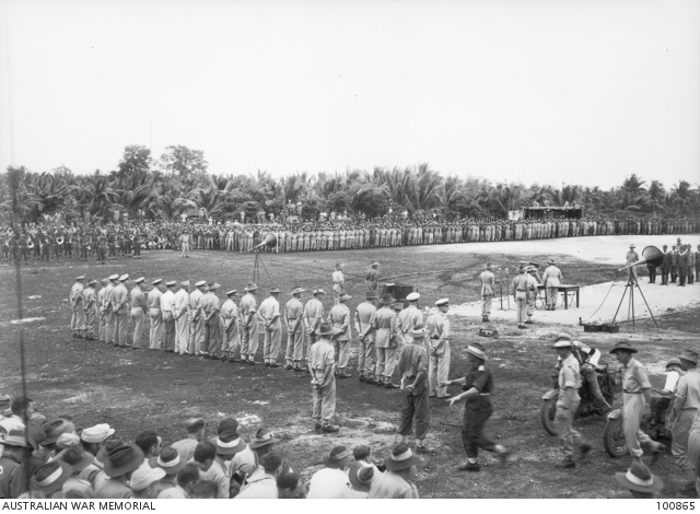 AWM: ''Morotai. 1945-09-09. The surrender ceremony of the 2nd Imperial Japanese Army. The surrender document was signed by Lieutenant General F. Teshima, watched by a large crowd of Allied service personnel.''