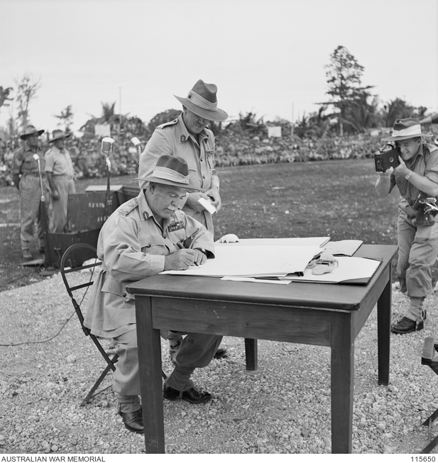 AWM: ''MOROTAI, August 9 1945. GENERAL SIR THOMAS A. BLAMEY, COMMANDER IN CHIEF, ALLIED LAND FORCES, SOUTH WEST PACIFIC AREA, ACCEPTED THE SURRENDER OF 2 JAPANESE ARMY FROM ITS COMMANDER, LIEUTENANT GENERAL F. TESHIMA IN A SPECIAL SURRENDER CEREMONY HELD AT 1ST AUSTRALIAN CORPS SPORTS GROUND. THE CEREMONY WAS ATTENDED BY REPRESENTATIVES OF ALL AUSTRALIAN SERVICES, AND TOKEN FORCES OF US, NETHERLANDS EAST INDIES AND INDIA. SHOWN, GENERAL BLAMEY SIGNING THE INSTRUMENT OF SURRENDER WATCHED BY MAJOR GENERAL W. BRIDGEFORD, GENERAL OFFICER COMMANDING 3RD DIVISION.''