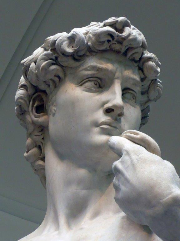 Head of Michelangelo's monumental marble statue of David before his battle with Goliath. Galleria dell'Academia. Florence. Italy.