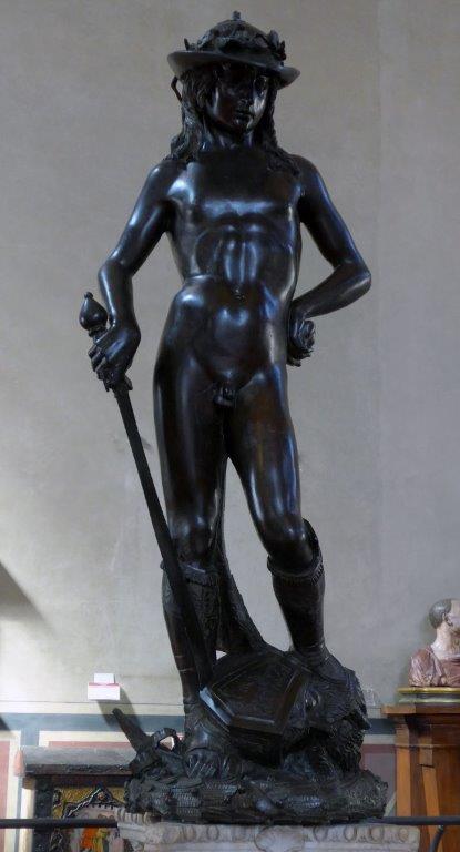 Bronze statue of victorious David, by Donatello. Now in Museo Nazionale del Bargello. Florence, Italy