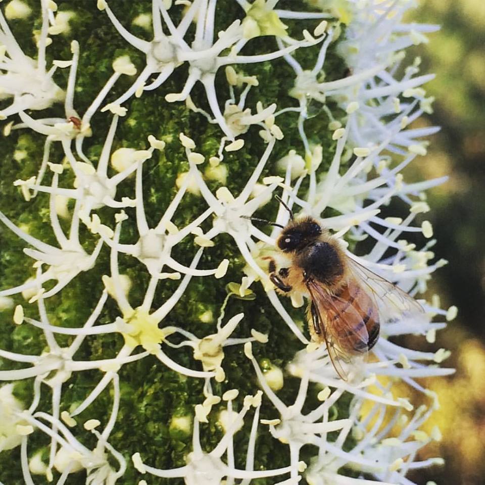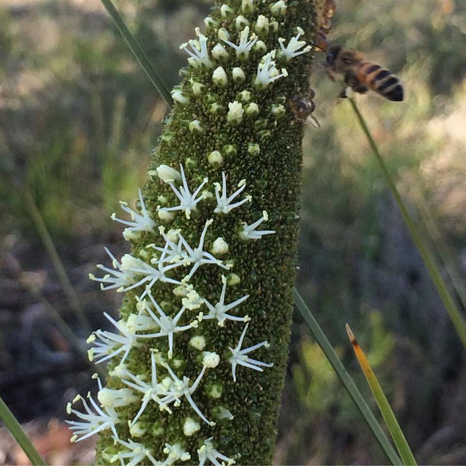 Bee on flowering spike of Western Australian grass tree (Xanthorrhoea preissii).