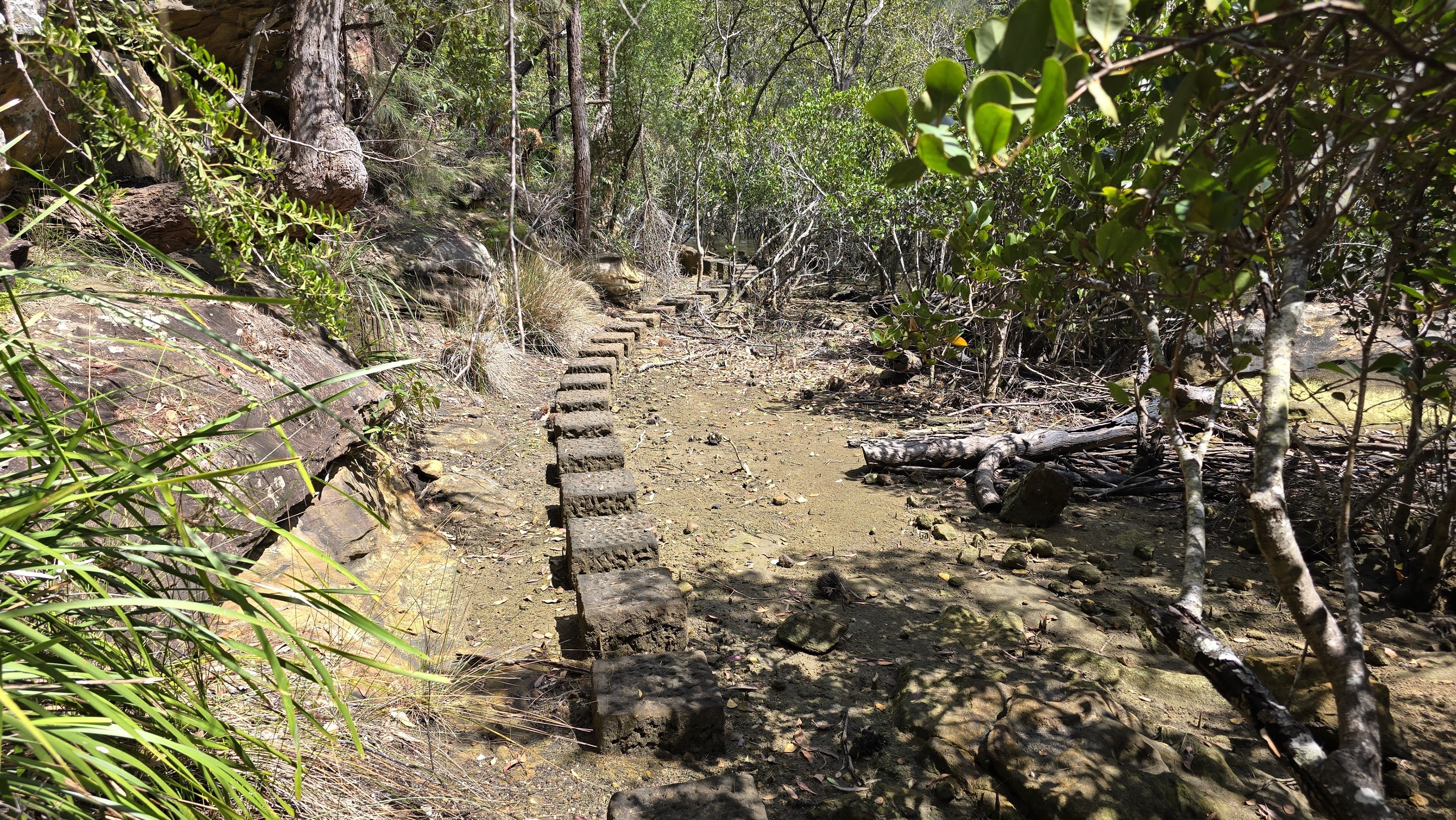 The men did not live there permanently but remained in the bush for months at a time - some took their families 6 with them - living in makeshift huts, some of wattle and daub with stringy-bark and slab roofs, others with sapling and hessian walls sealed with manure. All lived under the most primitive conditions but with plenty of fresh running water from the creeks or springs, and fish or game for the pot. The remains of the old wharf, built on an Aboriginal midden, are still there, partly submerged but still visible about one kilometre up Cowan Creek from Bobbin Head in an inlet known as Sledgehammer because of its shape.