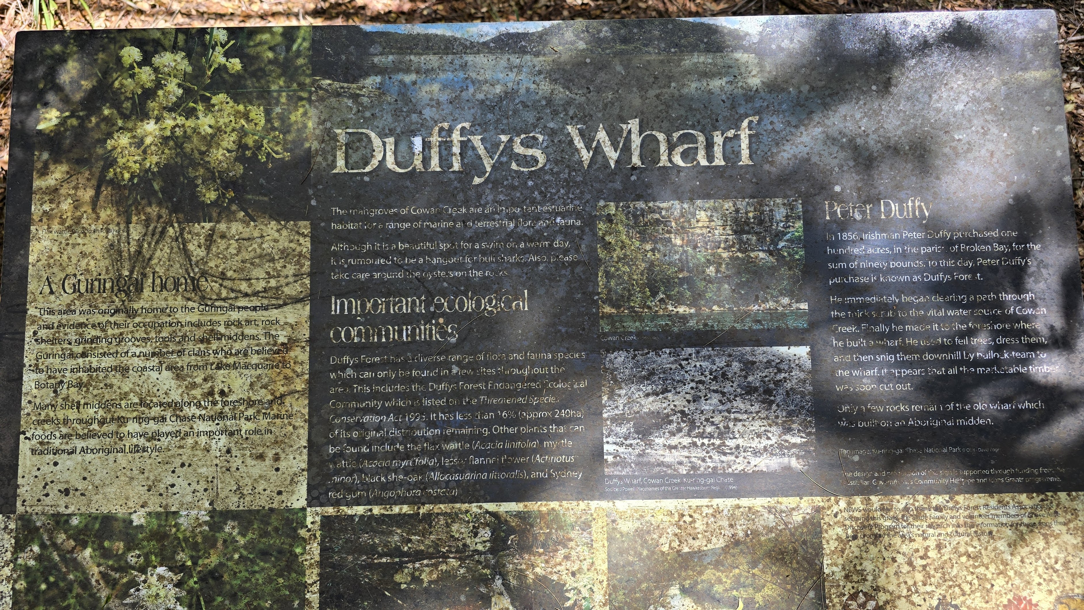 Duffys Forest is named after Patrick Duffy, who received a land grant there in 1857. He became a timber cutter and cleared a road through the bush to Cowan Creek, where he built a stone wharf for transporting timber. The wharf is still known as Duffys Wharf and the road is Duffys Track.